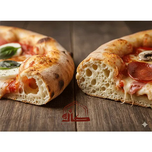 - خمیر ایتالیایی (Thin Crust): این خمیر با آرد مخصوص (معمولاً آرد ۰۰) درست می شه. استراحتش زیاده و وقتی میره تو فر سنگی، تو چند ثانیه پف می کنه و برشته می شه. توی لاهیجان، جوون ترهایی که دنبال طعم های مدرن هستن، این سبک رو می پسندن. چون سنگین نیست و بعدش می تونی راحت یه دوری دور استخر بزنی!